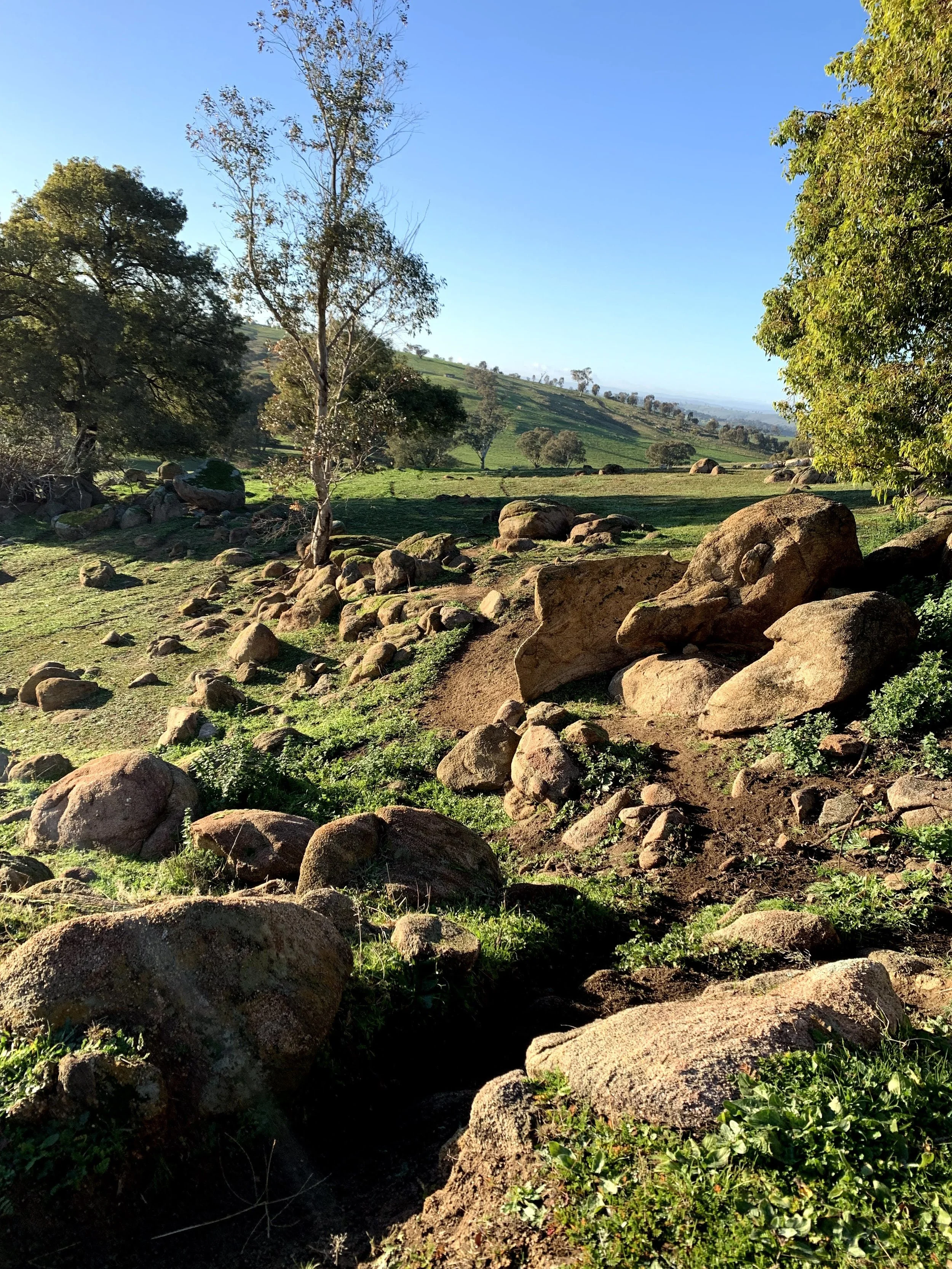 Guided hiking up the picturesque slopes of FigTree Retreat through rocky terrain with views towards the Snowy Mountains.